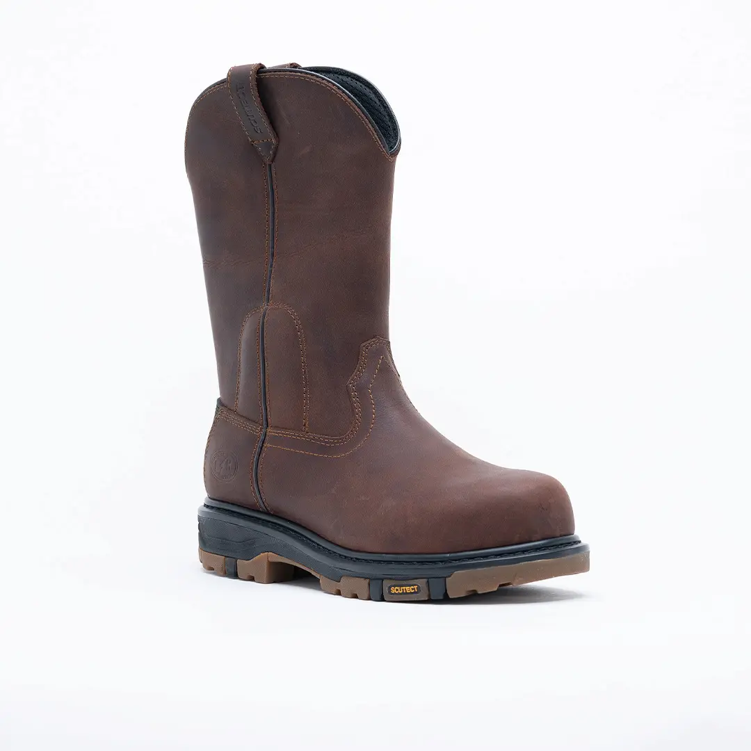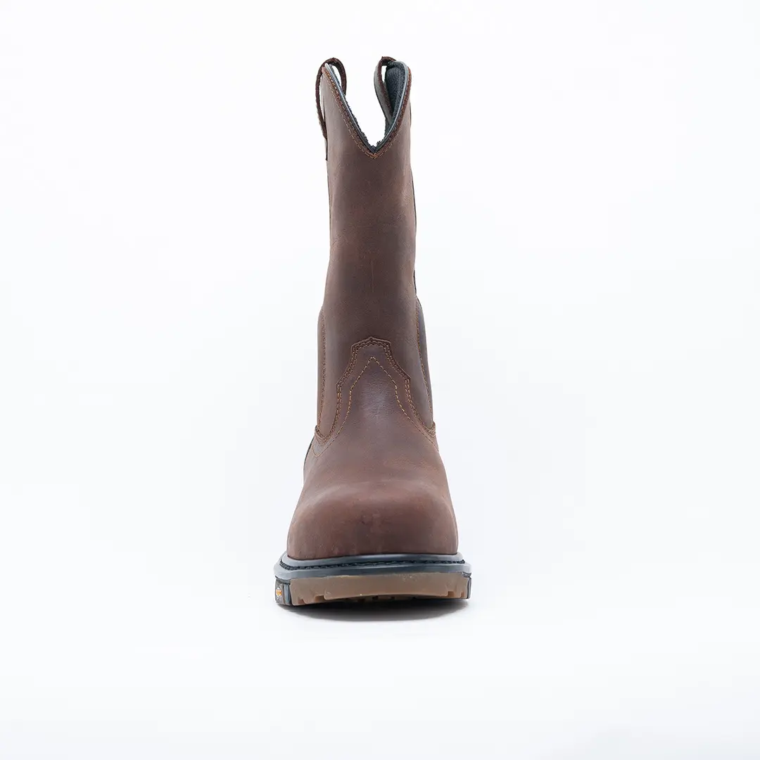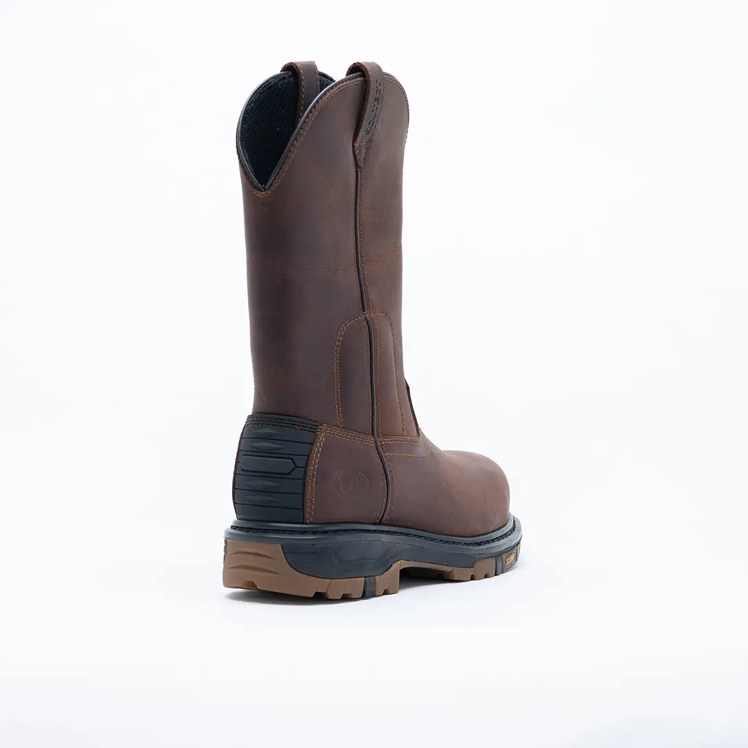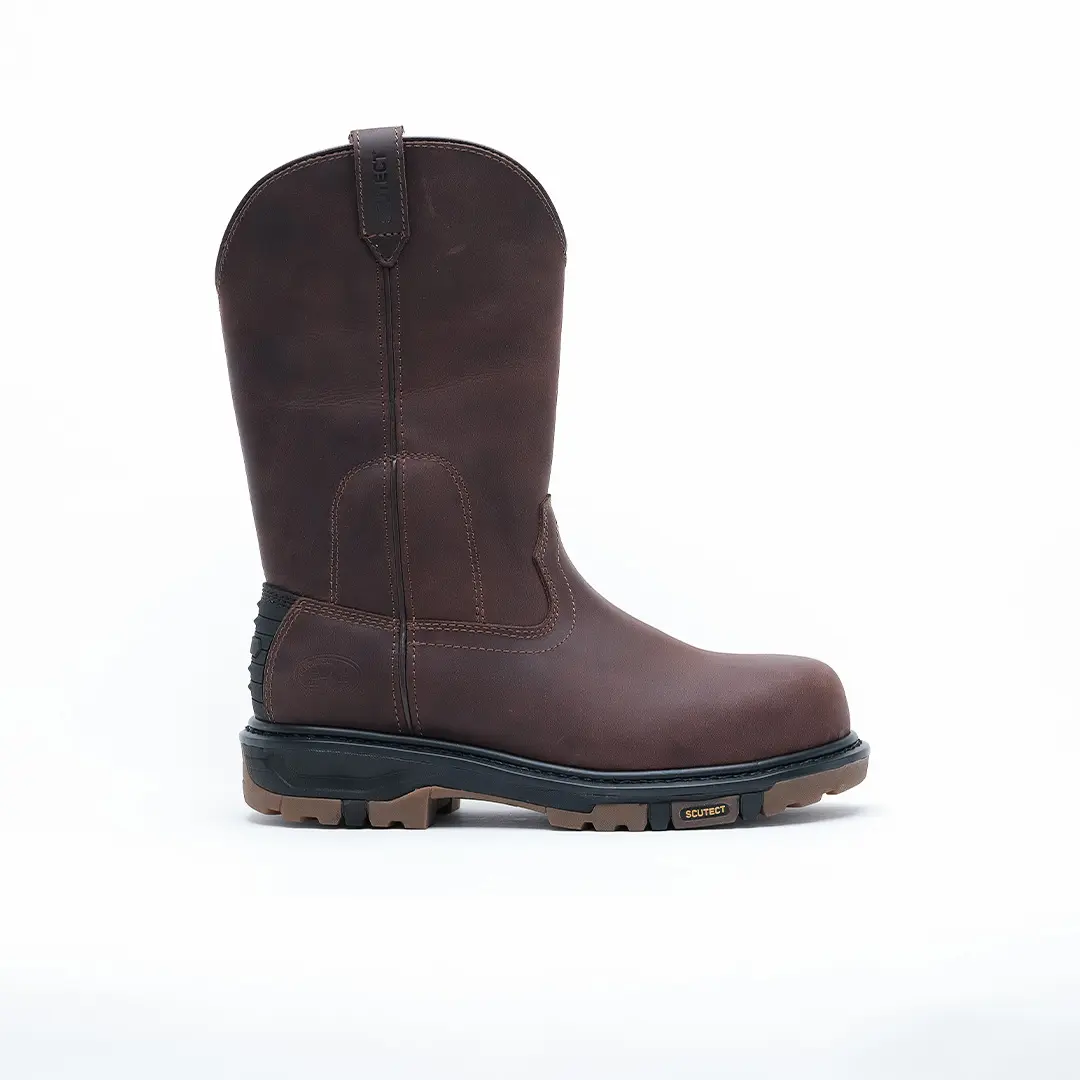 Capellada: Bota tipo Wellington de alta resistencia, cuero graso Crazy Horse, color café oscuro